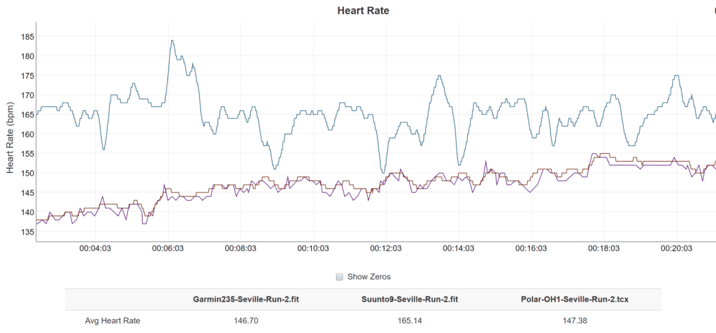 Unfortunately, the following three tests were less accurate to the point where I would say there was an issue with the watch or some truly awful placement on my wrist. Both the runs I did in Seville showed a massively elevated heart rate with the average BPM for the 2 runs being suspiciously close at 160.29 bpm and 160.22 bpm in comparison the Polar was 153.36 bpm and 148.95 bpm. So, on the second run, there was nearly a 12bpm difference between the two devices. My 1st run in Malaga where messed up both the Polar and Garmin tracking resulted in an average HR of 160.09bmp, which is also strangely close to the other results.