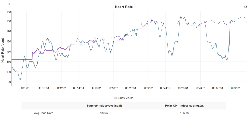 There is a good chance it could be a firmware issue, as when I got home I plugged the device into my computer and it updated. I did an indoor cycling session following this update, and this still had significant inaccuracies compared to the Polar (I forgot to charge my Garmin), but the problems here was a familiar issue I get with the Garmin, with the HR dropping off in parts for indoor bike sessions.