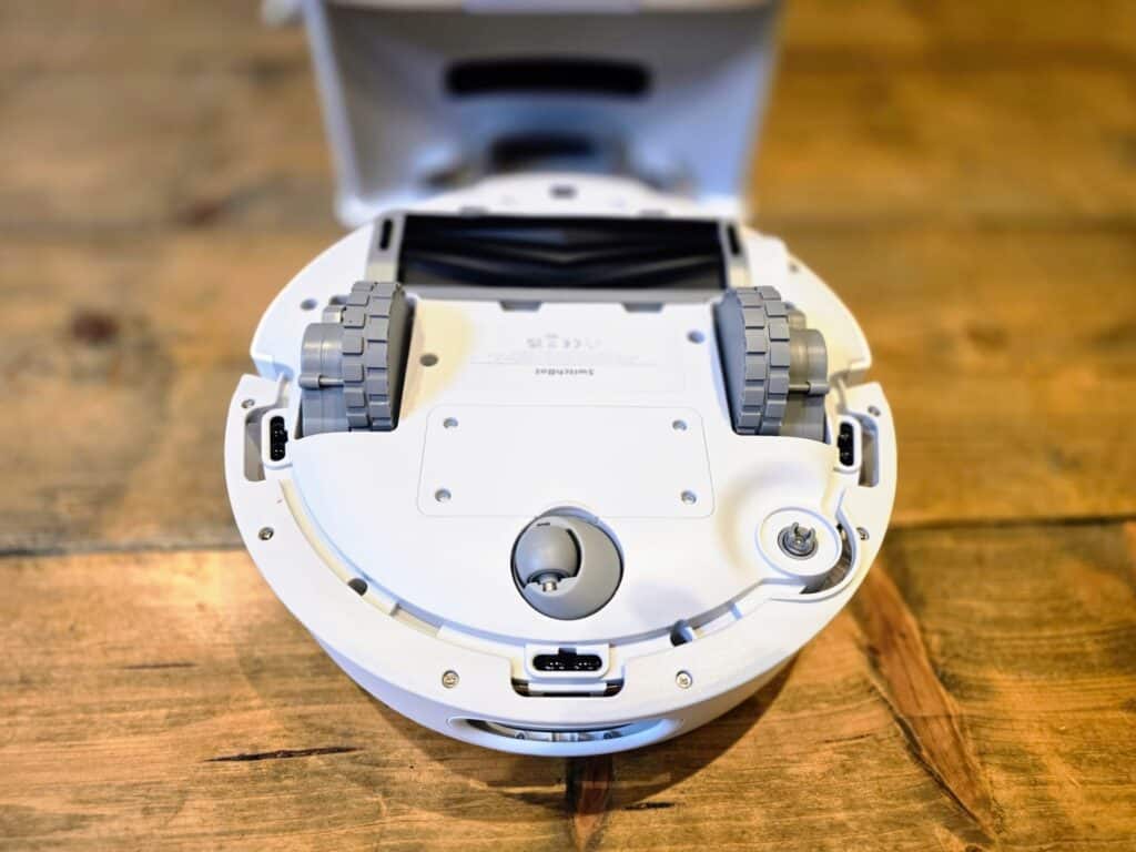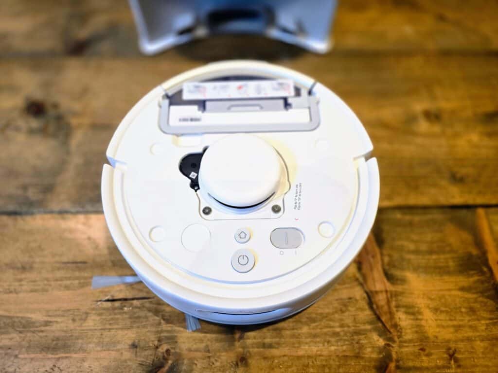 On the top of the unit, you’ll find simple controls for cleaning and returning to the charging station. The underside houses the main brush roller, side brush, and wheels. The dust bin is easily accessible for manual emptying when needed.
