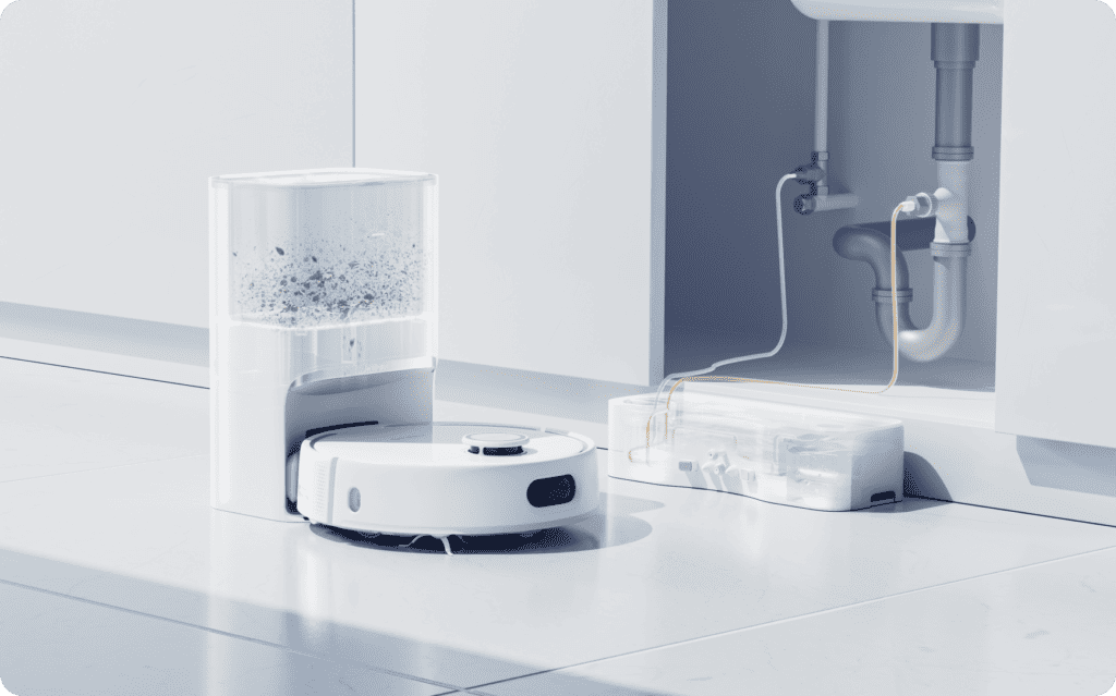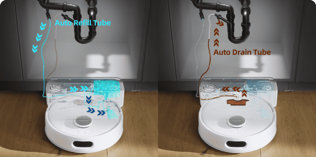 Unlike existing robot vacuums that require manual refilling and emptying, the S10 features a compact Water Station that connects directly to plumbing to automatically refill its water tank and drain dirty water. The Water Station has one pipe for clean water and another that links to the sewage drain, allowing the S10 to function much like a washing machine in self-supplying and draining water without any manual intervention.