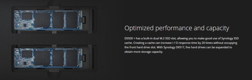 You also now have the added benefit of 2 x built-in M.2 2280 NVMe SSD slots for caching options offering read/write access speed improvements of 20-fold. You also have the possibility to expand up to 7 drives with a DX517 expansion unit