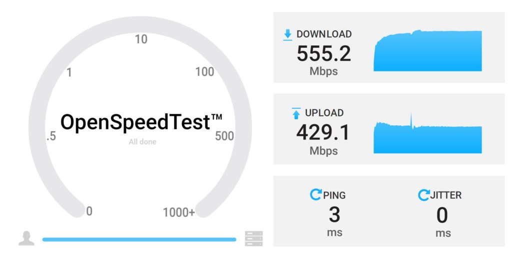 Close range to the main router, I was able to achieve over 450Mbps easily, which is an acceptable speed for a WiFi 5 system. OpenSpeedTest is a little more forgiving with download speeds hitting 555Mbps.