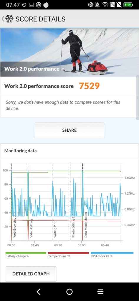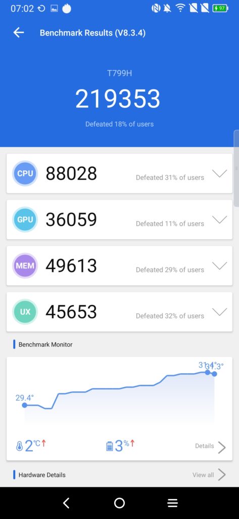 Its Antutu result is not great, sitting in between the old Snapdragon 712 and the recently launched budget focussed Mediatek G80.