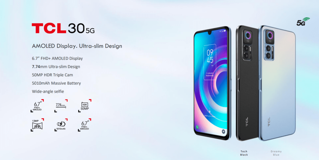 At MWC 2022, they have announced five new phones, with the most expensive being the TCL 30 5G priced at €249, which works out as £210. This features the MediaTek Dimensity 700 a 6.7-inch AMOLED display with 4GB RAM and 128GB storage.