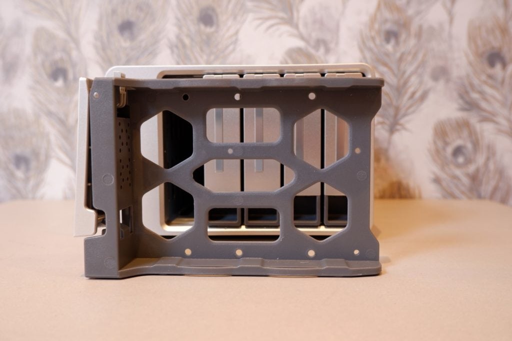 While this may not appear very appealing compared to network storage which allows multiple computers to access it all the time. It comes with some significant advantages, most affordable NAS drives are limited to gigabit ethernet, that means you are going to get a max transfer speed of around 110MB/s. USB3.0 is rated at 5Gbps, so in theory, you could transfer at about 600MB/s, though this drive is advertised as hitting 410MB/s. Similarly, the equivalent number of bays in a NAS drive costs a lot more, the 4-bay F4-210 is £239.99 while the 5-bay F5-221 is £369.99.
