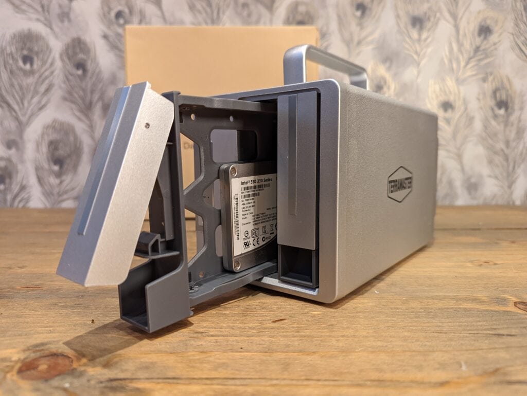 The overall design of the TerraMaster TD2 is similar to the TerraMaster NAS enclosures I have reviewed, which quick-release slide-out drive cages. The drives themselves need to be screwed into place in the cage, and you have screw holes that will allow you to use 3.5 inches or 2.5-inch drives.