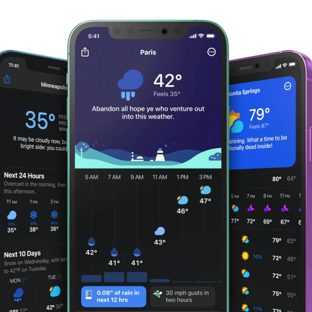 Carrot Weather is an award-winning app that pulls data from Dark Sky ensuring that you get accurate weather reports right down to up-to-the-minute forecasts. There are widget options for iOS and Apple Watch as well as premium features availed upon subscription.
