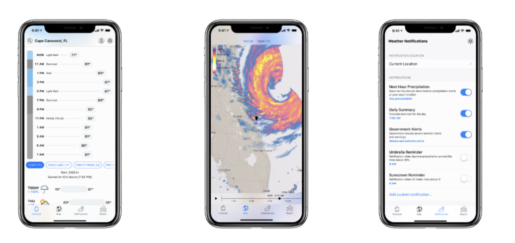 On the Today Tab, you will get all the information you need to know such as temperature, rain, humidity, and many more in a simple yet attractive way. The AccuWeather app provides other useful details such as sunrise/sunset times, air quality, hurricane tracker, allergy data, and radar imaging. An outstanding feature of the app is the live radar that tracks ice and snowfall, storms, clouds, and temperature changes.