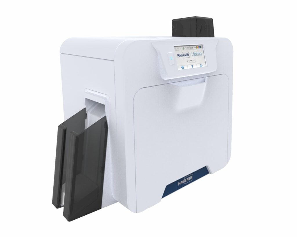 Unlike the other printers on the list, the Magicard Ultima uses retransfer technology. This means that the printer uses the ink ribbon to print the design onto film, which is then laid and heated onto the card. The full surface of the card is fully printed with ink, which means that there isn’t a white band around the design.