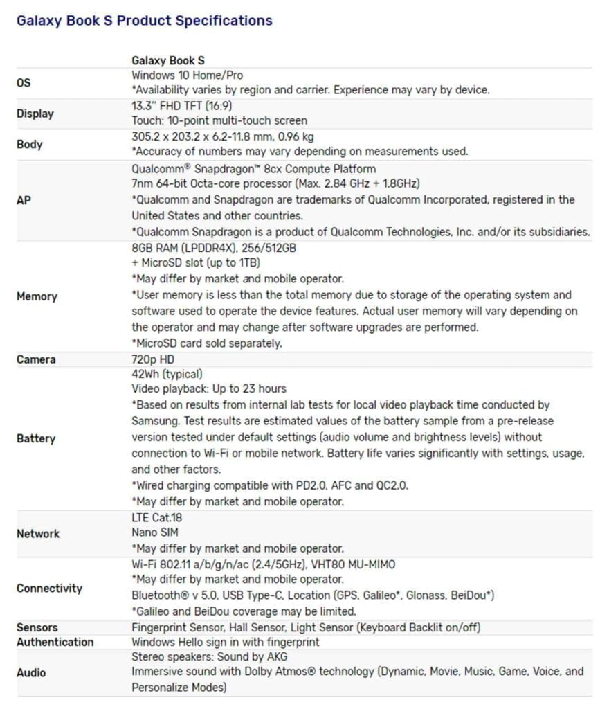 The Galaxy Book S sports a 13.3-inch FHD TFT display with a 16:9 aspect ratio and supports 10-point multi-touch. Thanks to the tiny and low powered Snapdragon the laptop weighs just 0.96kg. That makes it one of laptops on the market. For comparison, the Surface Pro 6 weighs 770g without its keyboard, and the LG Gram weighs 1.09 kg.