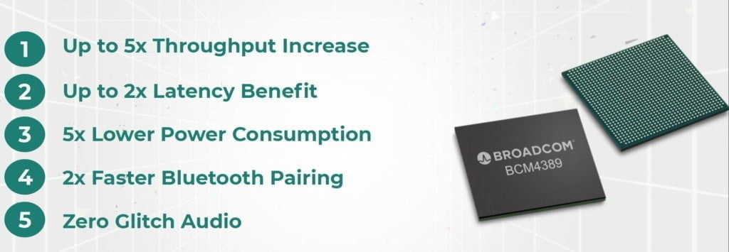 The Bluetooth 5.0 functionality has also received a boost with MIMO support. Broadcom claims that the new implementation can reduce pairing time by a factor of 2 and also alleviate glitching issues when connected to Wi-Fi at the same time (compared to the BCM4375).
