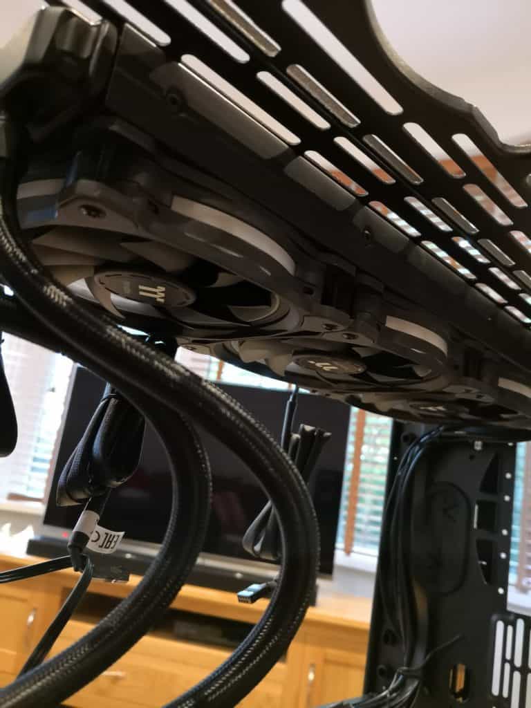 Switching off PWM and putting them into performance mode, they spin up to full speed at 1600RPM. At this point they are very audible but not intrusively so, the sound profile is quite pleasant, and most background noise drowns this sound out. In particular, the GPU fan noise is far higher when they spin up compared the CPU.