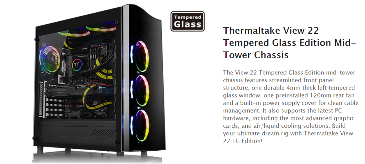 If you are a gamer on a budget wanting a great looking easy to work with case I thoroughly recommend the Thermaltake View 22 Tempered Glass.