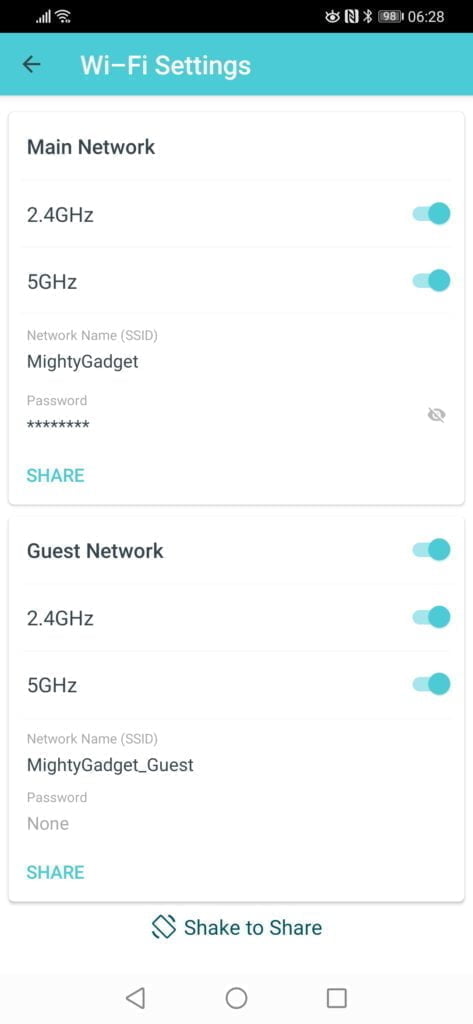 However, when it comes to the Wi-Fi settings themselves, things are much more limited. You have an option for the main network and a guest network, and you can change the SSID, password and also choose if you want to use 2.4Ghz and/or 5Ghz. I prefer to keep them separate, so for me I would have to use my guest network as a 2.4Ghz channel for IoT devices.