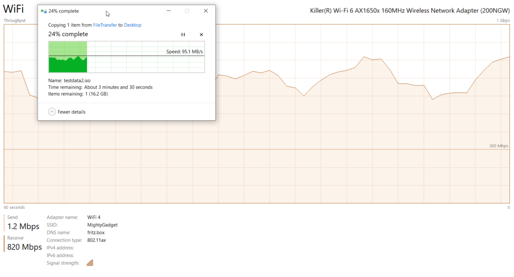 Using the Asus USB-AC68 adaptor which has a 3×4 MIMO design, it is possible to connect at 1.3Gbps. With this speed, I am able to achieve speeds of over 980Mbps consistently with a file transfer basically capping out the gigabit connection at 113MB/s.