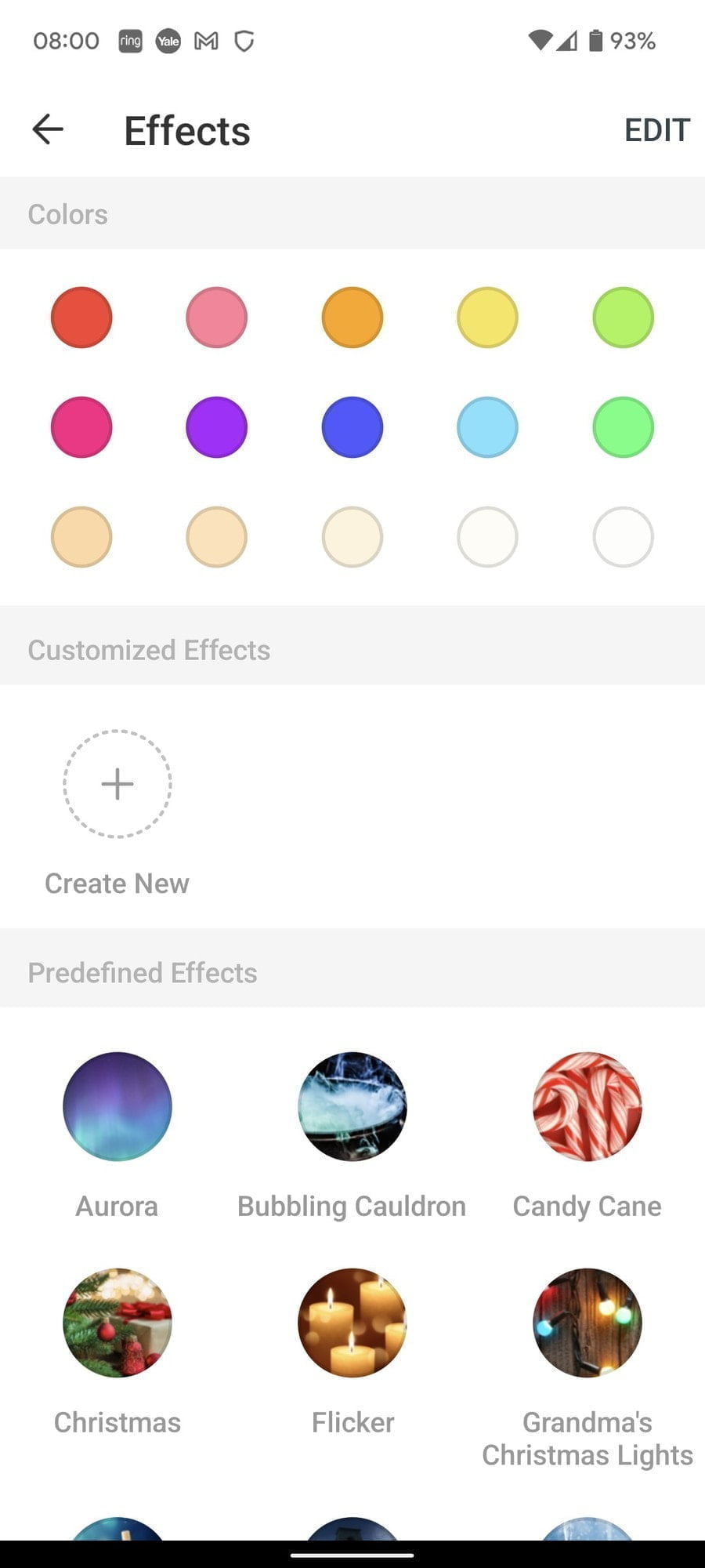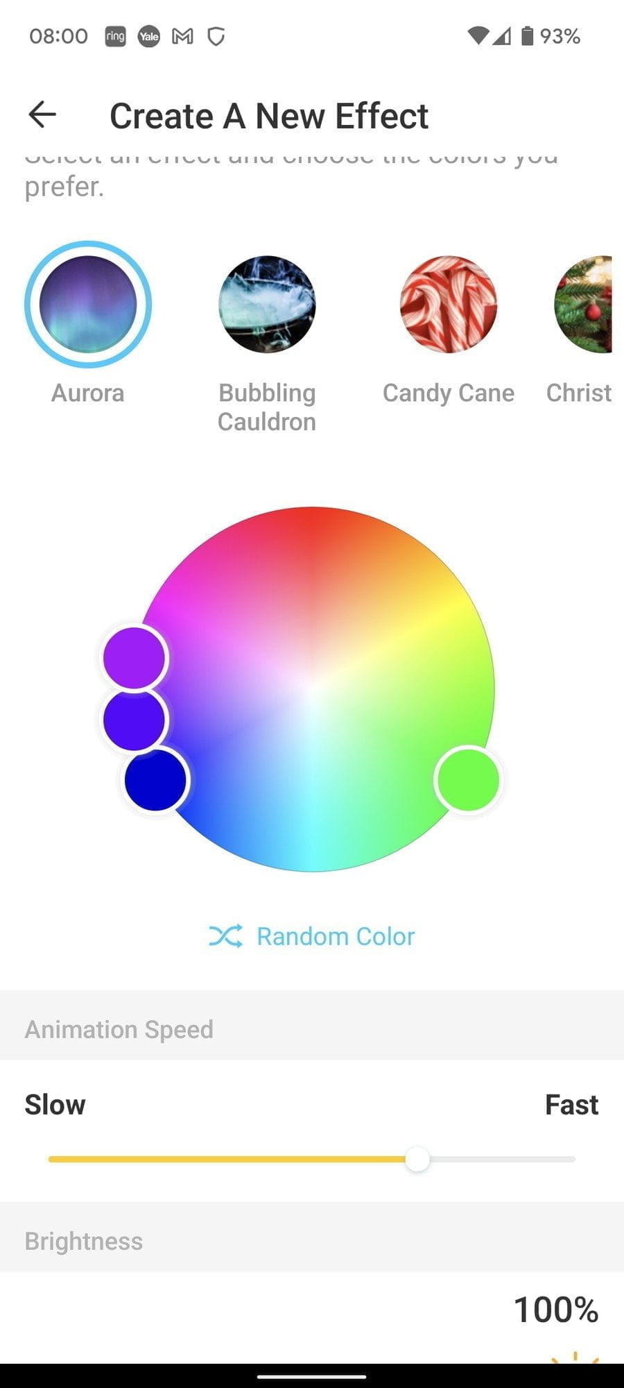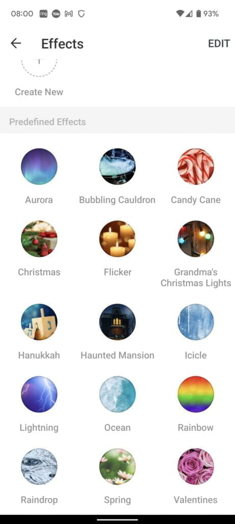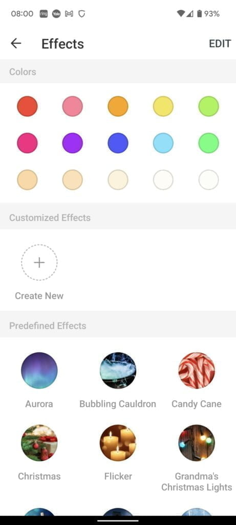 There is an effects page that gives you a wider selection of colours and some predefined effects. These basically switch between colours/brightness etc. The effects are quite basic, due to the limitations of the RGB, you can get a bit of a twinkly effect with some of them, which is good for decorations.