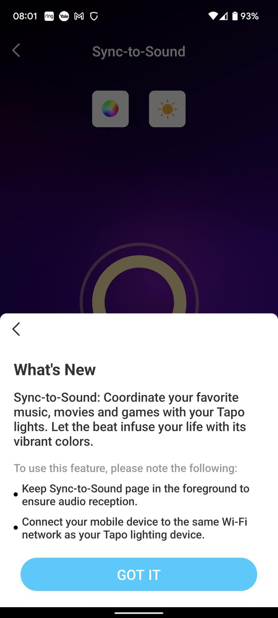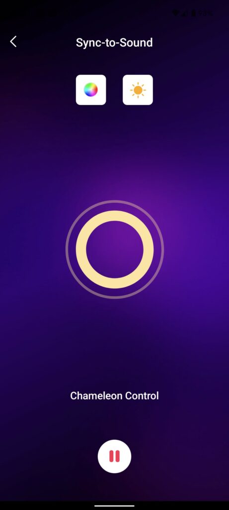 You then have a sync-to-sound function. For this to work, you need to leave the app open in the foreground, so it is not the most practical solution if you plan to use it for the evening. As you might guess, with this enabled, it will use the microphone on your phone to synchronise the light with the music being played.