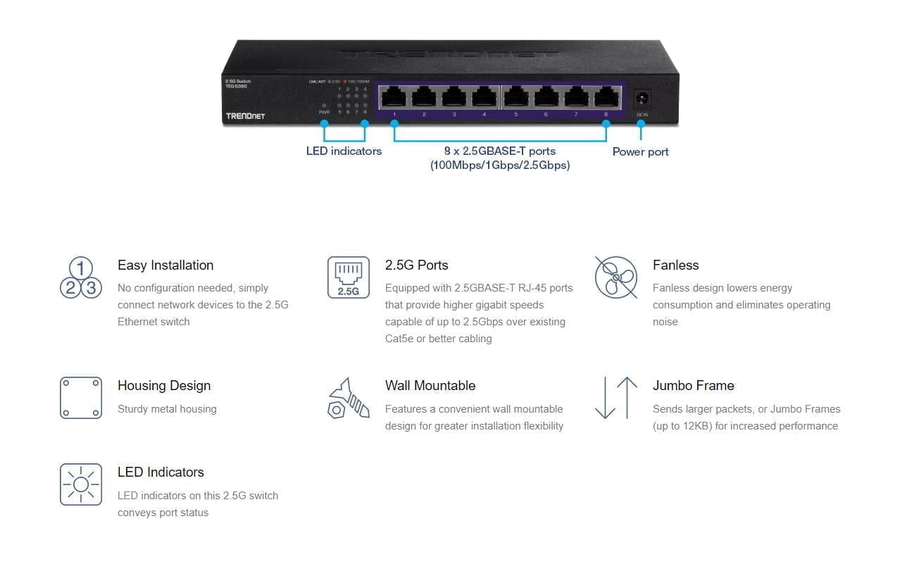 TRENDnet’s 8-Port Unmanaged 2.5G Switch (TEG-S380) and the 5-Port Unmanaged 2.5G Switch (TEG-S350) are currently available for purchase. They can be found online on the TRENDnet Store, and worldwide through authorized distribution and retail partners.