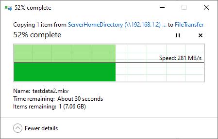 Transferring to and from NVMe drives on my server, the speeds sit at a steady 280MB/s when transferring a 15GB MKV file, which ended up taking 55 seconds to transfer, which, as you would expect, is well under half the time a gigabit connection would do it in.