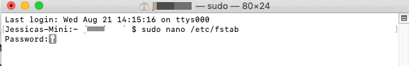 Step 4: Copy and paste the command LABEL=VOLUM_NAME nono ntfs rw,auto,nobrowse and hit Enter. Change the VOLUME_NAME to the name of your external hard drive. If you have multiple NTFS drives/volumes to write, write different line for each of them. Then hit Enter.