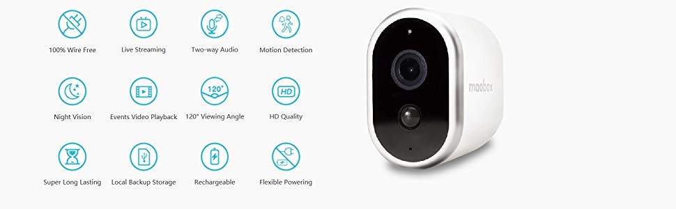 Moobox claims that the camera has up to 4 months running on one charge. Plus, Moobox cameras have a 120° wide angle lens, 2-way audio, PIR motion sensor, IR night vision to 16 feet and more.