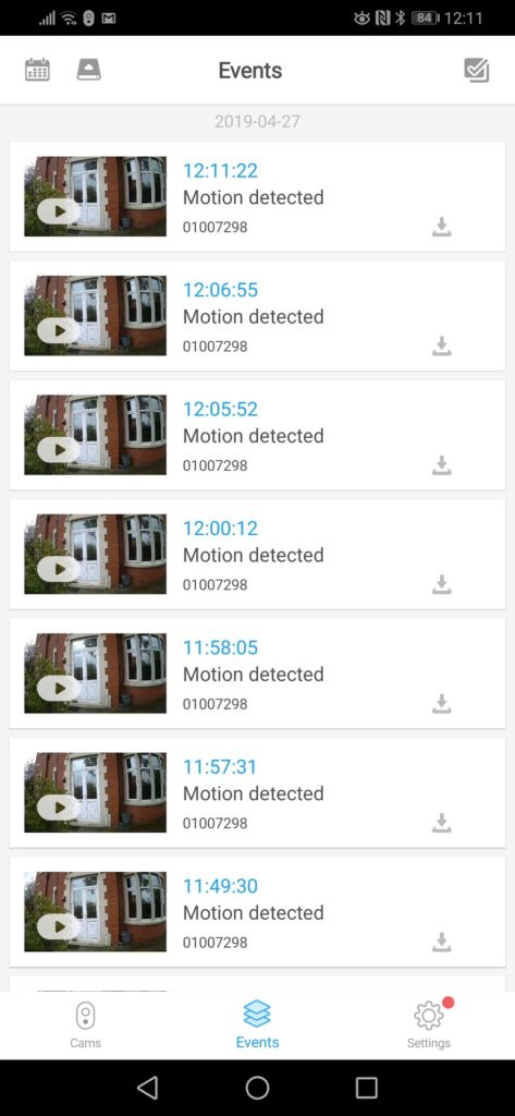 Viewing and download events that are triggered by motion is very simple, with the interface logically laid out with a thumbnail of the video, camera name and time of recording. You have the option to load the footage in landscape giving you a detailed view of any video recorded. Downloading a video is a quick tap of the download button.