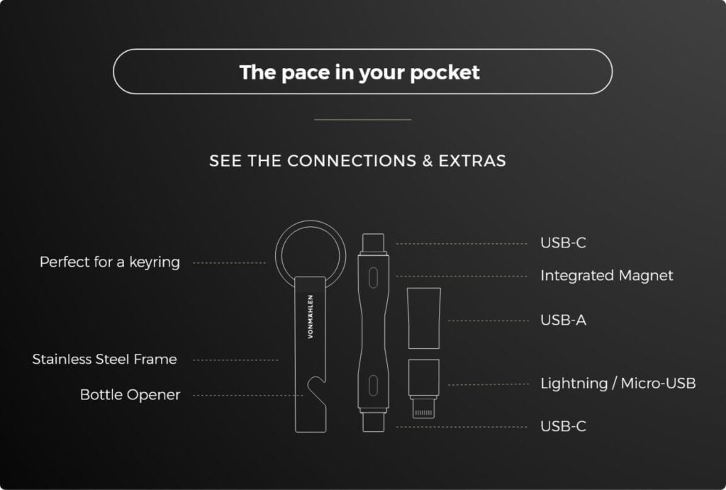 The Vonmählen High Six aims to solve this issue with a handy keyring which contains an ultra-short USB-C to USB-C cable plus a USB-A and Lightning/Micro-USB adaptor. Plus, it is a bottle opener, which is always handy.