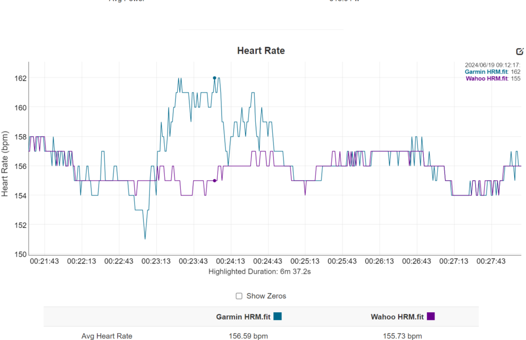 Apart from the average BPM, when I plotted the heart rate data in a graph, both the Garmin and Wahoo tracked each other almost perfectly. On the few occasions where the readings strayed, it appears that Garmin was at fault. In one example, there was a jump of up to 7bpm compared to the Wahoo for almost 90 seconds before settling back down.