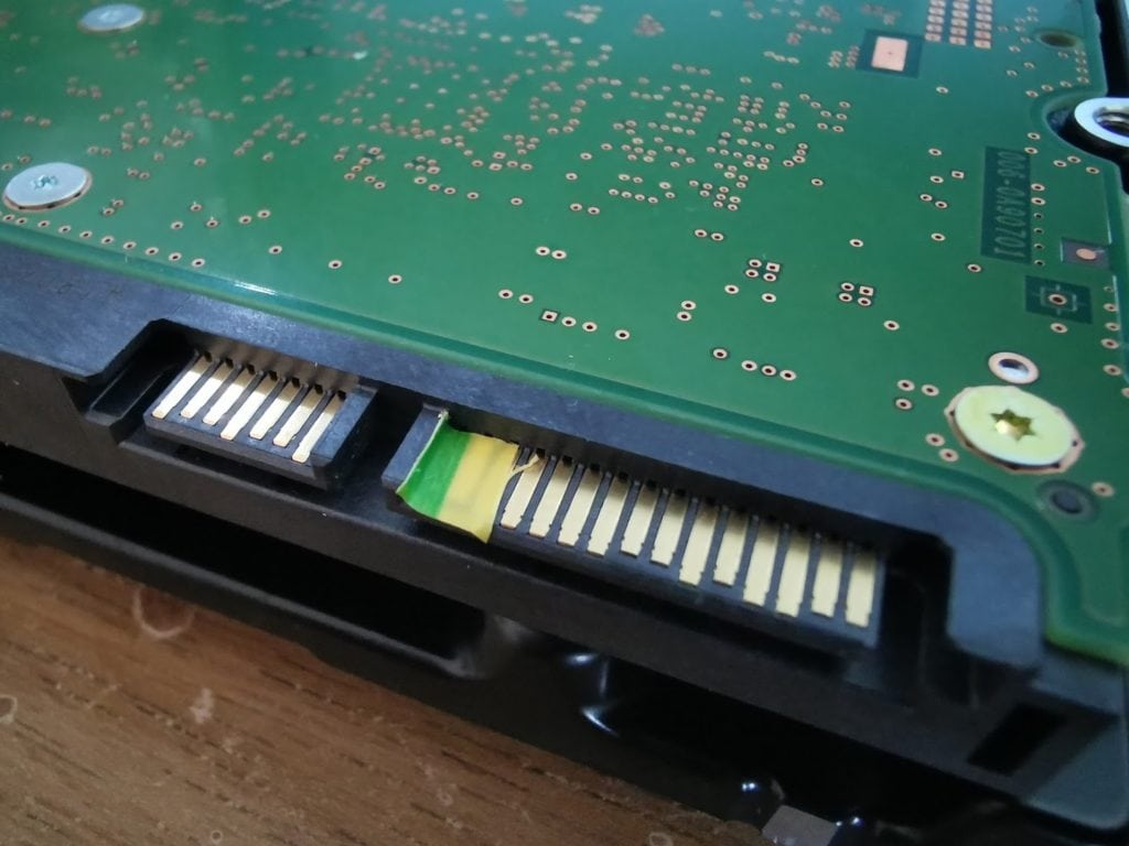 This is a special type of non-conductive tape that’s stable at both low and high temperatures and is yellowish in colour. Take a piece of backing paper from a sheet of labels and place the tape onto it. Then take a piece of cardboard and place it underneath. The goal here is to cut a thin strip of tape – enough to cover that third pin – so take a razor and gently slice off a strip of tape. Next, on the hard drive, locate the third pin, and gently apply the tape. I highly recommend that you use an ESD wrist strap while you’re doing this, as you are touching the contacts of the drive. The tape is too long for the pin, so snip off the excess with some scissors.