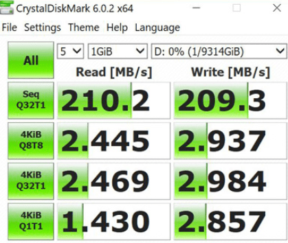 Testing with CrystalDiskMark when using it as a USB drive the speeds are around 210MB/s read and write.