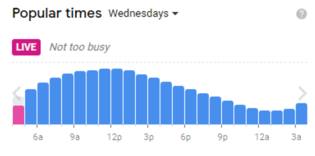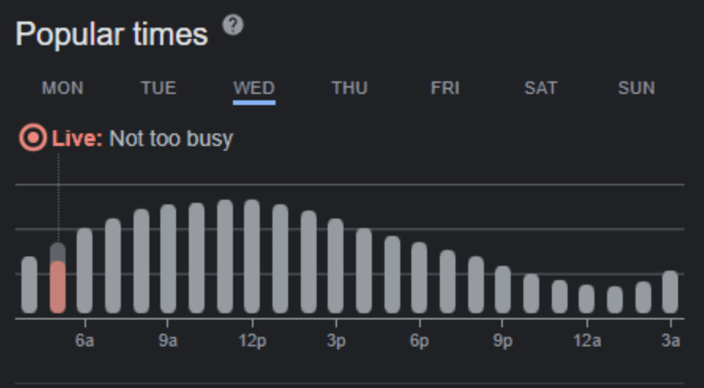 You can then view the live data or the data based on past trends. You can select days, and if you are accessing the popular times from a normal web search, you should be able to click on the time. This will then say things like: