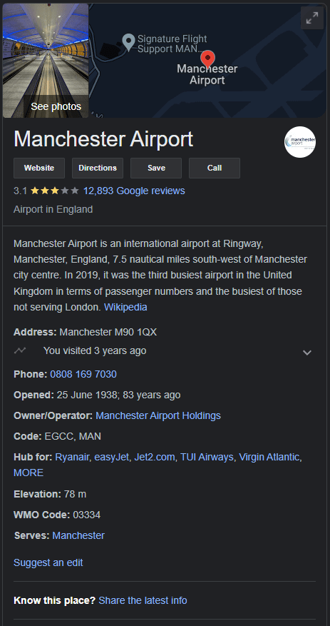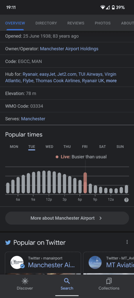 - When you search for a place, such as Manchester Airport, either on your phone or desktop, you will be shown the Google Rich Card for the business. If you scroll down, there will be a small graph showing you the popular times.