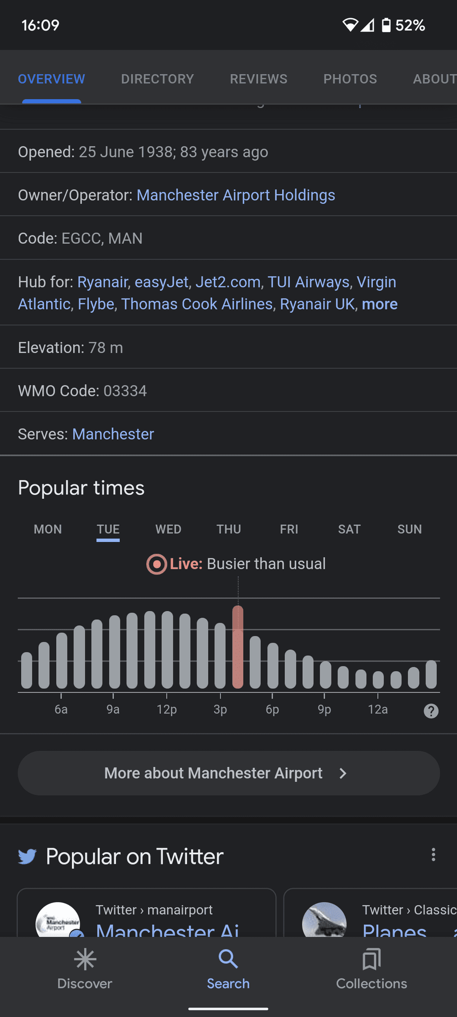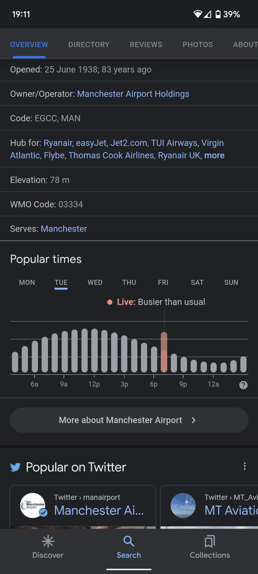 - When you search for a place, such as Manchester Airport, either on your phone or desktop, you will be shown the Google Rich Card for the business. If you scroll down, there will be a small graph showing you the popular times.