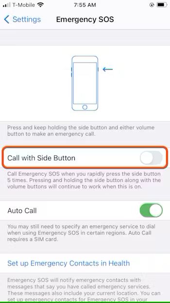 - Here you will find the ‘Call with Side Button’ switch. By default, this should be turned on. This feature allows you to press the side (or top, depending on your model) button five times rapidly to call emergency services. You can turn this off by swiping the switch to the left.
