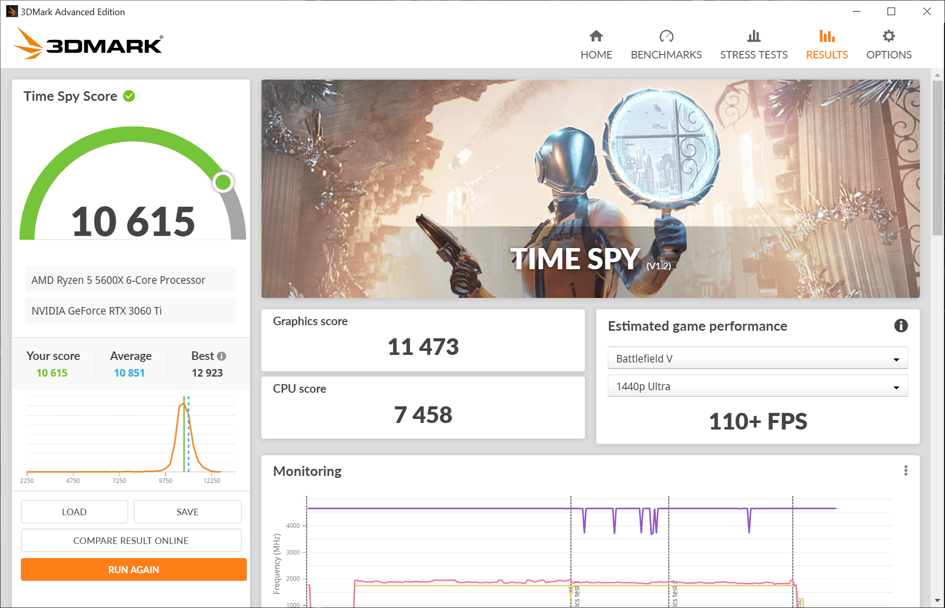 - 3DMark 13 – Time Spy: 10615 (Graphics: 11473, CPU: 7458)