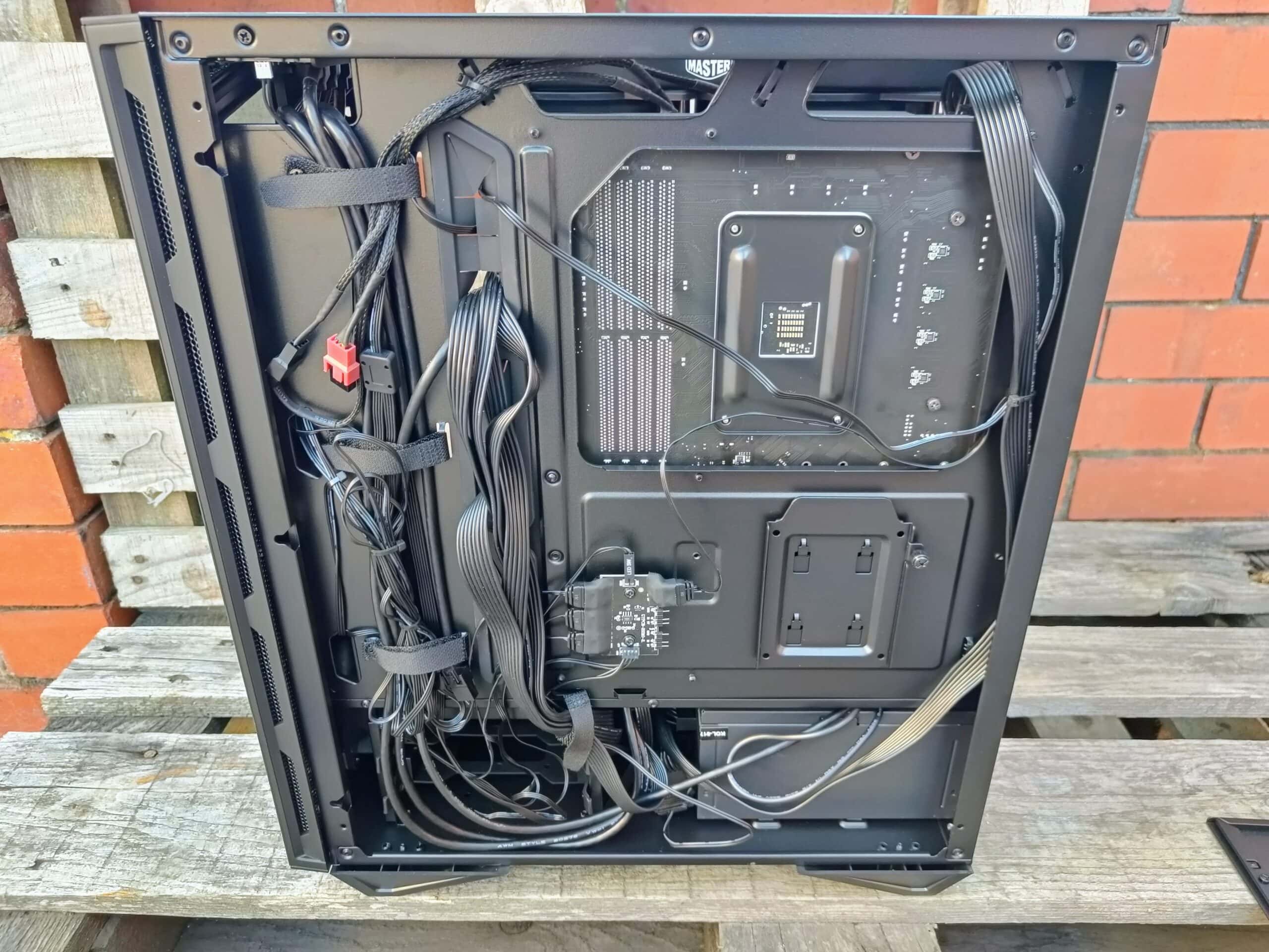 The case has a slide on the metal right panel, which I prefer compared to a second glass panel. This hides the mess of cables on the rear side. Wired2fire have tidied things up nicely using Velcro cable ties, but you can pay for upgraded cable management.