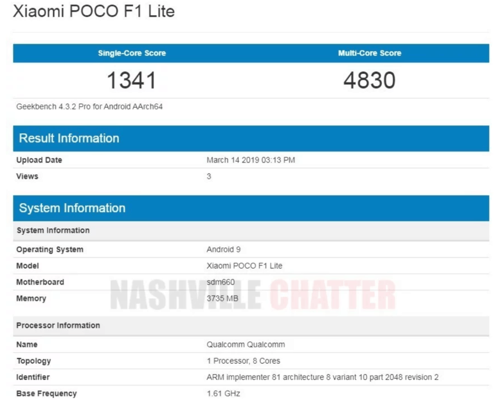 A recent listing has shown up on Geekbench under the name Poco F1 Lite. According to the listing, the phone will be powered by a 14nm Qualcomm Snapdragon 660 AIE octa-core chipset, coupled with 4GB of RAM. The device scored 1,341 points in the single-core and 4,830 points in the multi-core test on Geekbench. As for software, the listing reveals the handset is currently being tested on the Android 9.0 Pie operating system.