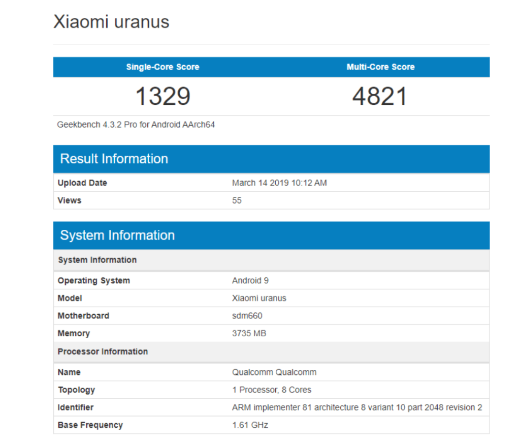 Interestingly, a mysterious Xiaomi smartphone with the codename “Uranus” was also spotted on the Geekbench database earlier today with the exact same specifications. The device scored 1,329 points in the single-core test and 4,821 points in the multi-core test. Even though cannot be sure, there is a possibility of “Uranus” being the codename of POCO F1 Lite.
