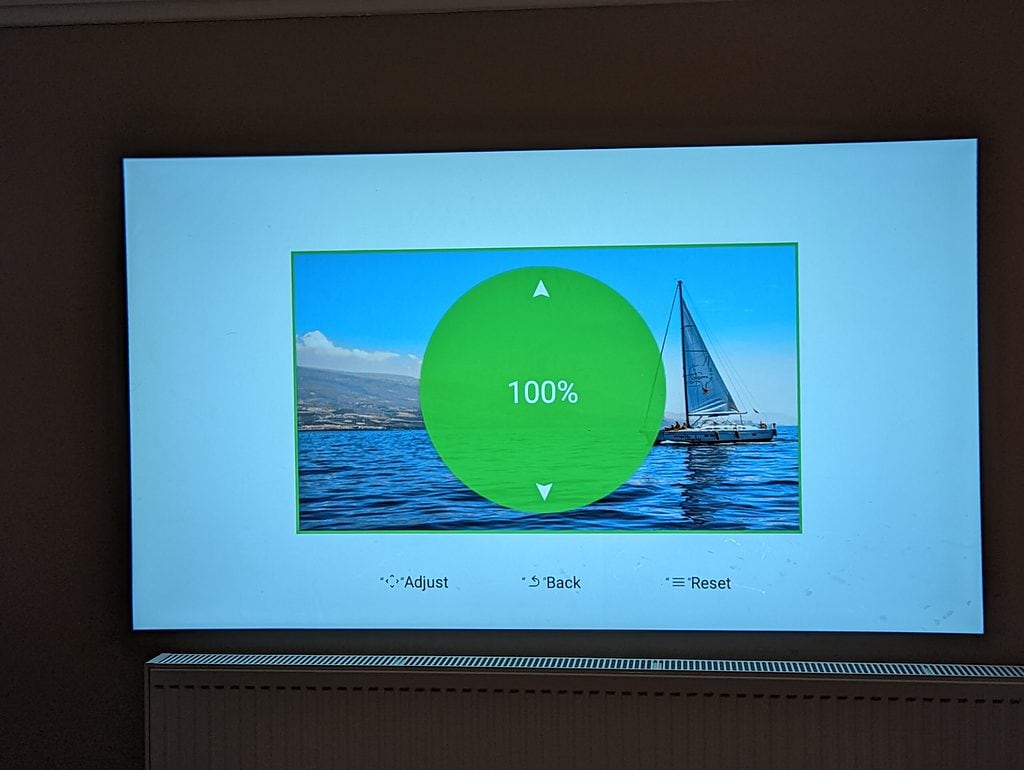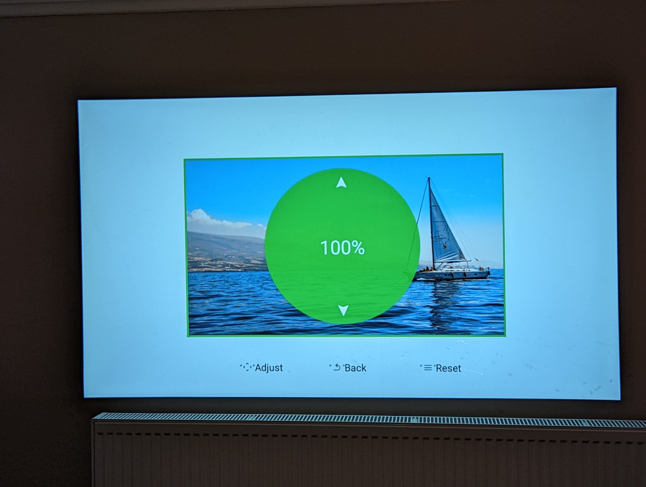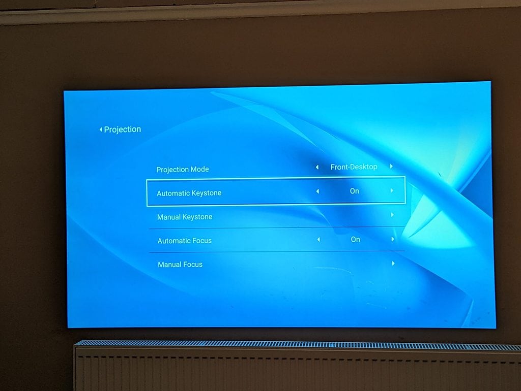 When you switch on the projector, it will do automatic focus, which I found to be quite accurate and rarely required me to intervene. You can then use the automatic keystone correction. This mostly works well, using my radiator as a guide, the image is projected at a bit of a wonky angle, but the image itself is a rectangle rather than being skewed. Overall, the focus and keystone correction works much better than the Yaber V10.