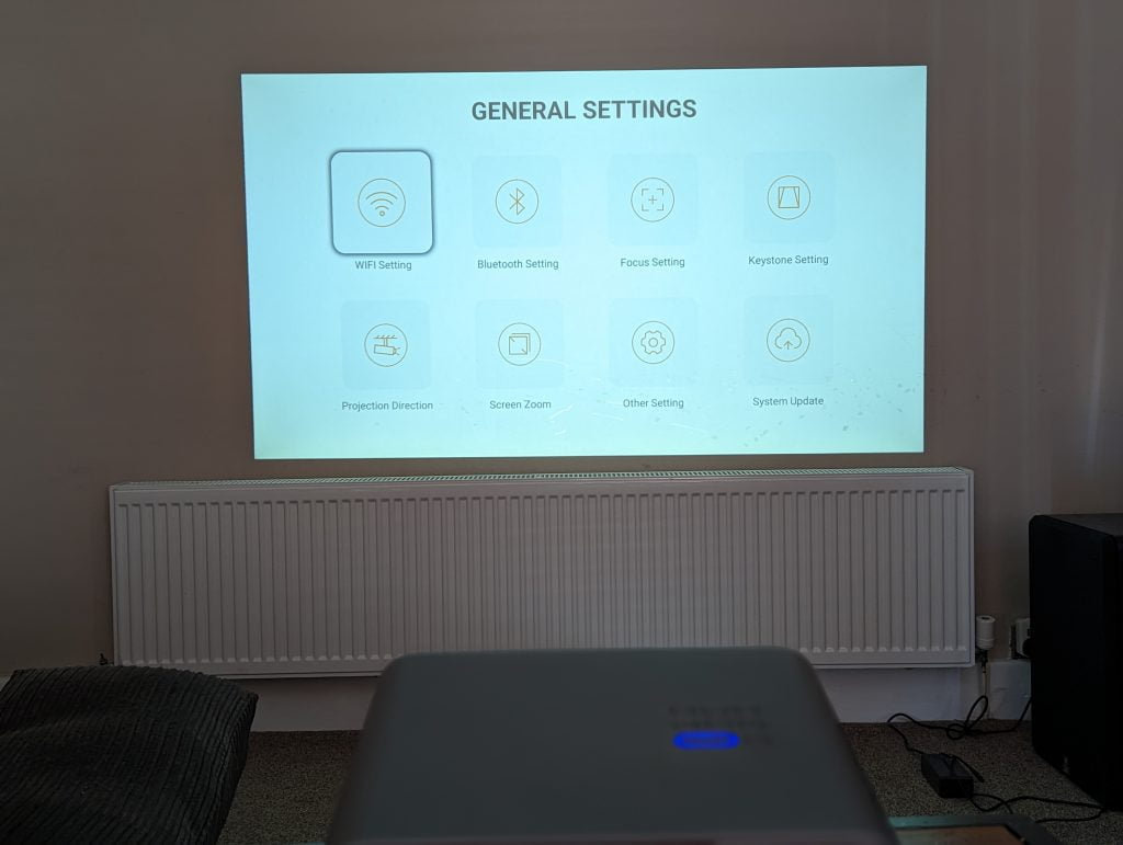 Similar to the Yaber Ace K1, this projector has a screw-based angle adjustment. When I reviewed the Yaber Ace K1, I said that this prop was too short for my room, and I couldn’t get the image to be projected above where my radiator is. I haven’t experienced the same problem with this projector, I think the screw is close to its maximum height, but it is angled enough to get past the radiator.
