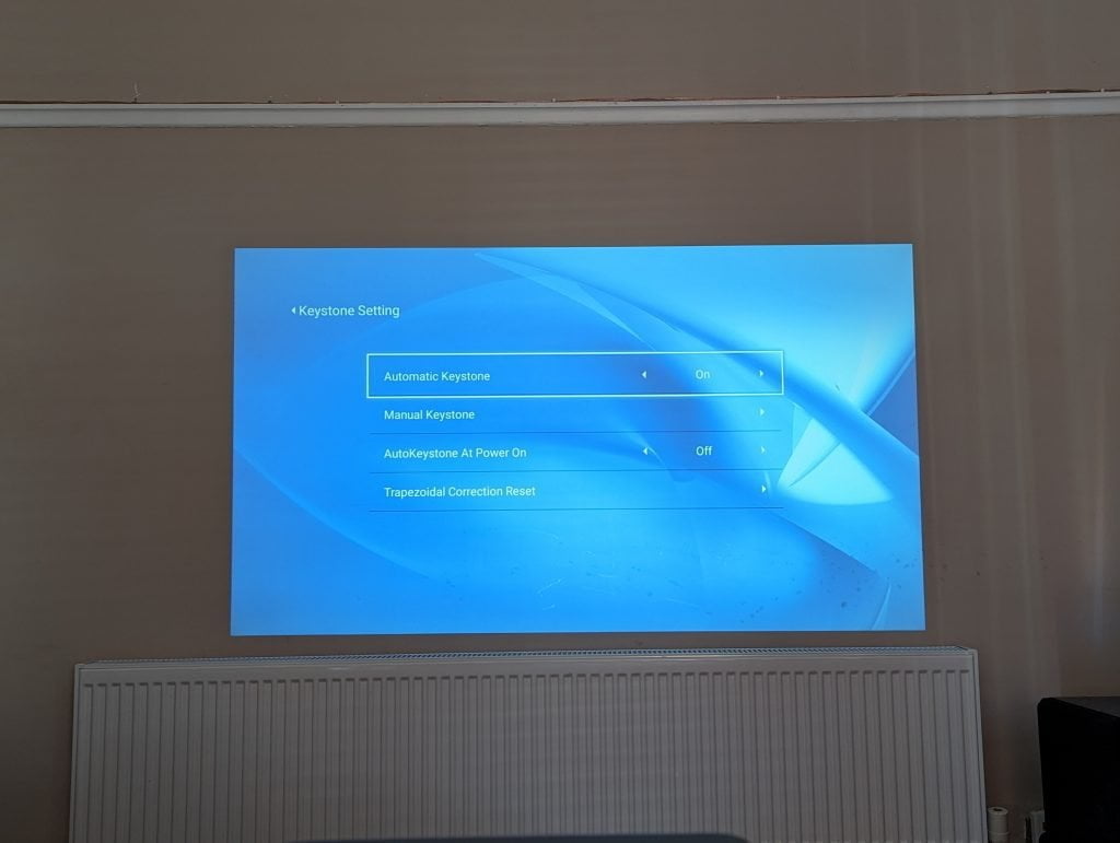 Out of the box, this has an automatic focus which seems to work effectively. However, at first, the keystone was wonky, likely due to the angle I was projecting at.
