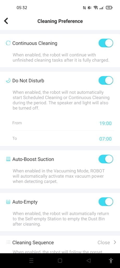 With auto-clean you can have it return to base when it is running low on battery, then when it is charged, it will restart from where it left off (I was unable to test this bit due to my issues with the station).  You can also enable quiet times, so the vacuum won’t start automatically return to cleaning when you are asleep.