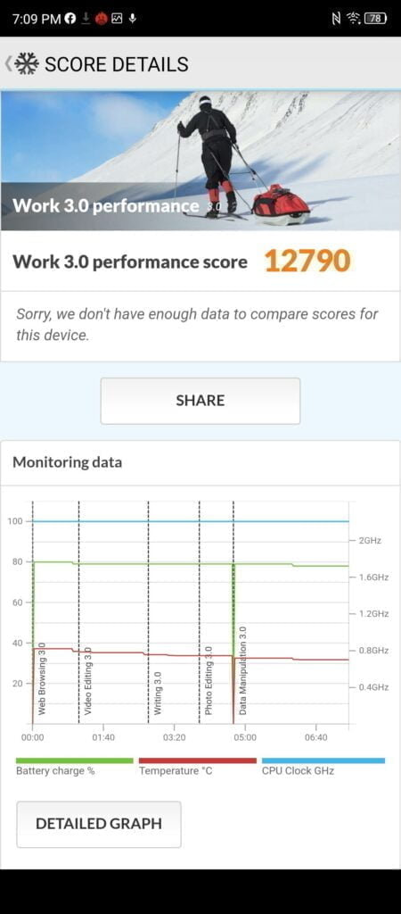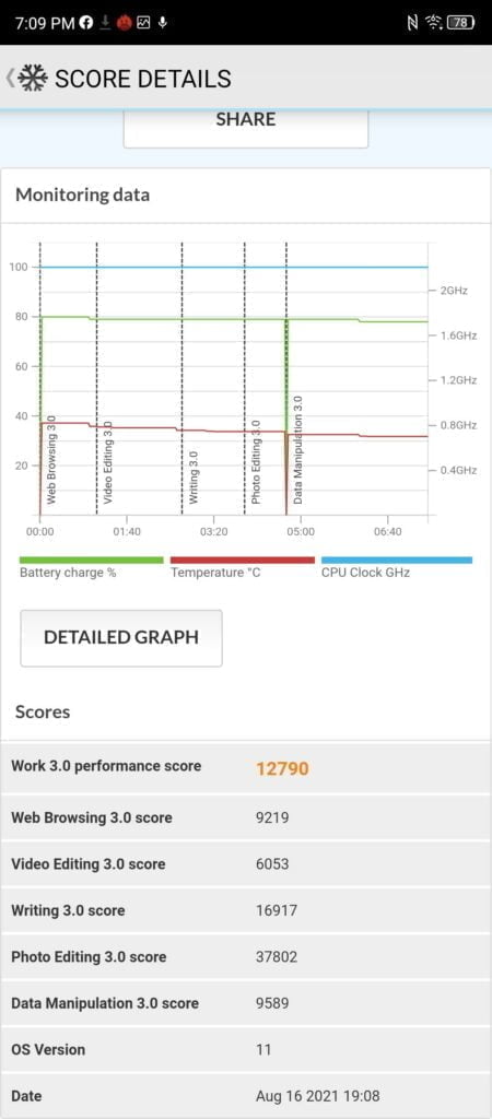 On a less positive note, the phone has a suspiciously high PCMark Work 3.0 score. The monitoring data shows the CPU clock at 100% throughout the test, with the end result being greater than the SD888 equipped OnePlus 9 Pro achieved. PCMark results seem to be inconsistent between brands, with each company choosing to clock things differently, so I wouldn’t read too much into it. The Realme GT did the same, achieving a massive 16792. All this really proves is how poorly benchmarking relates to real-world performance.