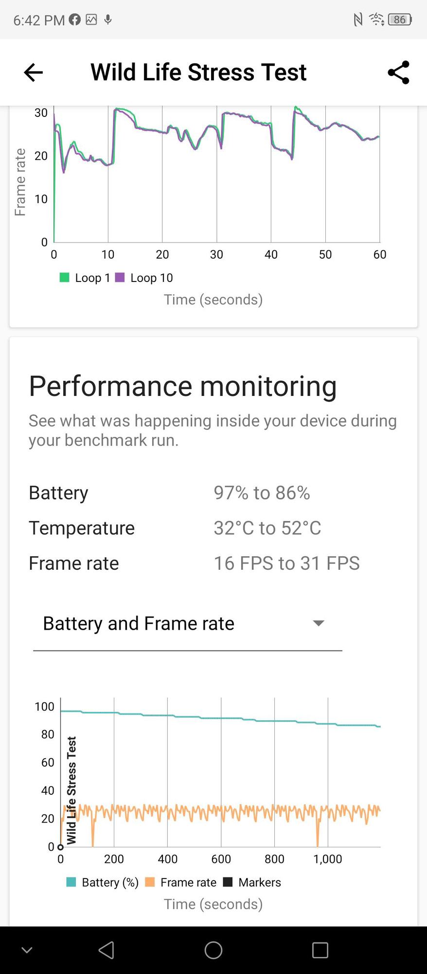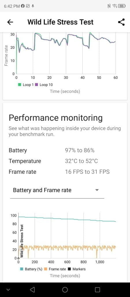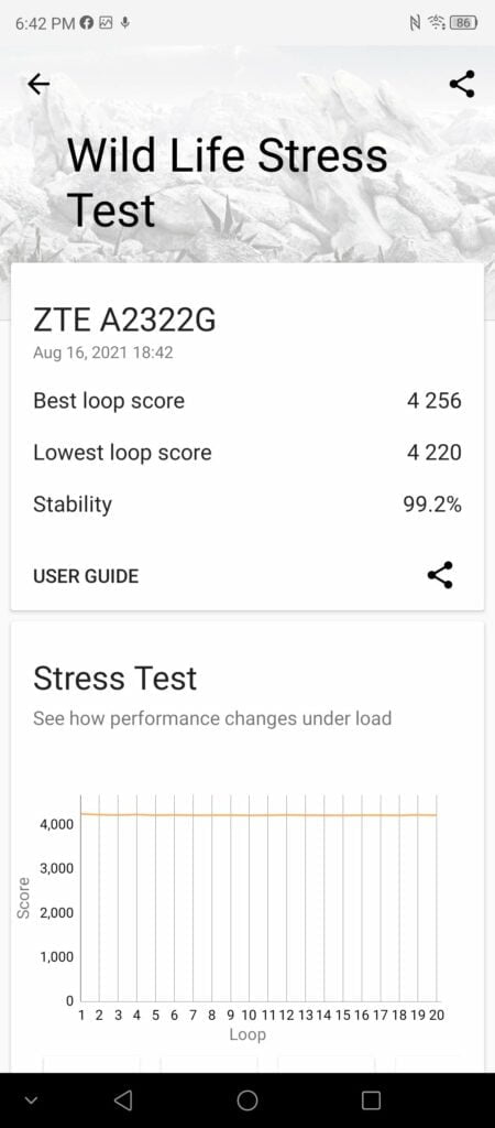 The 3DMark Wild Life stress test shows the phone scoring a high of 4256 and a low of 4220 with a stability of 99.2%. While the SD888 scores much higher initially, the thermal throttling means that towards the end of a 20-minute test, a phone such as the Realme GT ends up scoring less than this, thanks to its poor 55% stability. I am not sure if or how much this would affect real-world usage, but it is something worth considering when looking at SD888 equipped phones. You have no concerns with stability with the ZTE Axon 30 or any other SD870 phones.