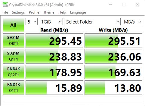 Crystal Disk Mark is a little more favourable, with read and write speeds being recorded at 295MB/s