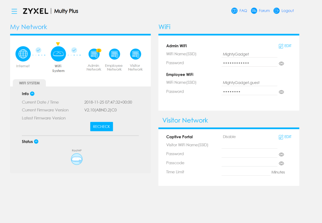 During the setup procedure, you will be able to set up three separate Wi-Fi networks including the main Admin network, an employee network and the optional captive portal where you will be able to define a time limit for connections.