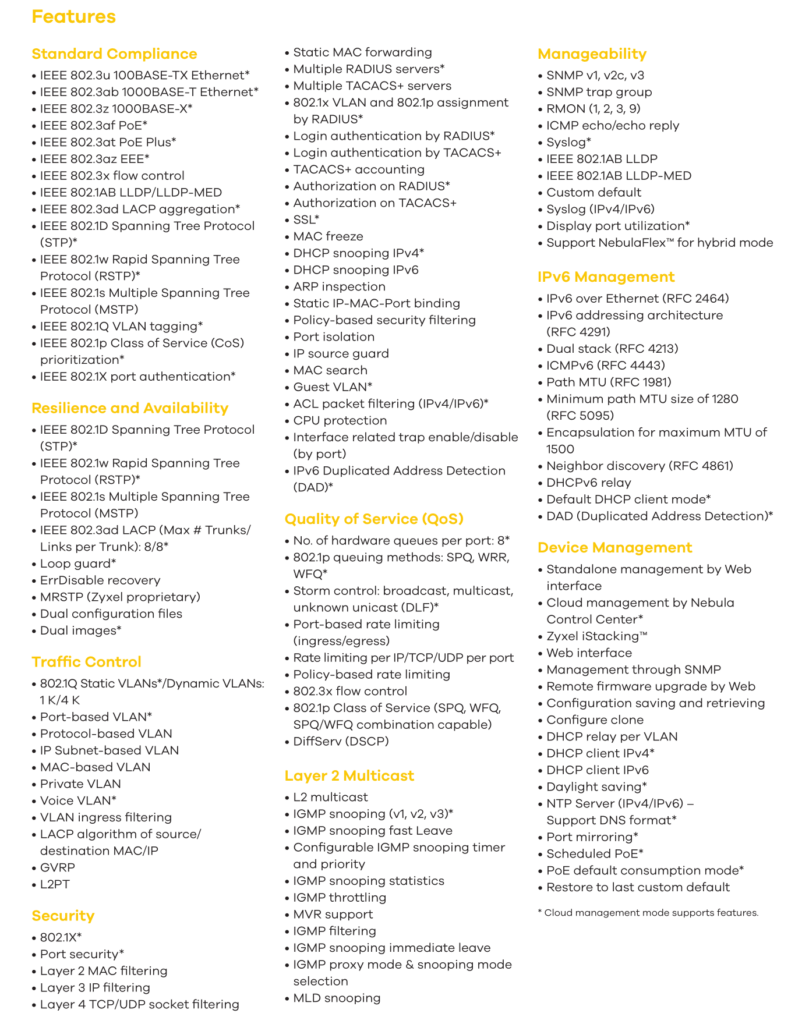 - Quality of Service (QoS), storm control, port based rate limiting, flow control